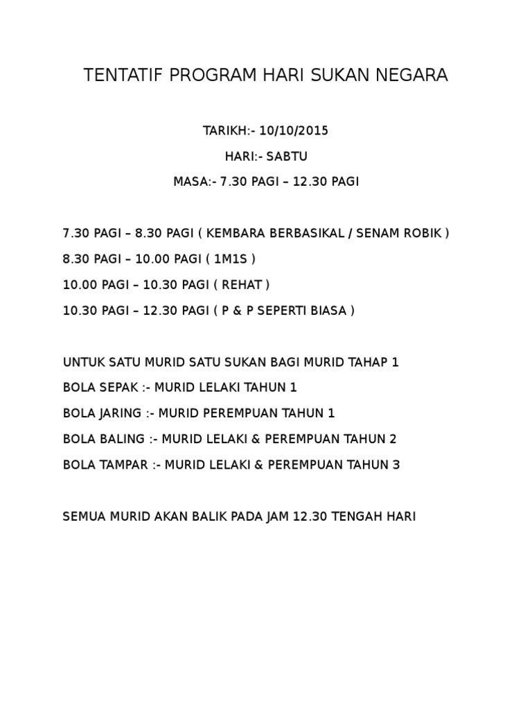 Tentatif Program Sambutan Hari Sukan Negara Peringkat Smk Tambunan Pdf